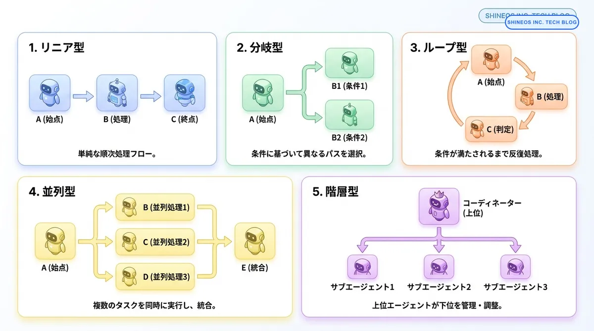 AIエージェントワークフローの設計には、いくつかの代表的なパターンが存在します。それぞれの特徴と適用シーンを理解することで、業務要件に最適な設計を選択できます。