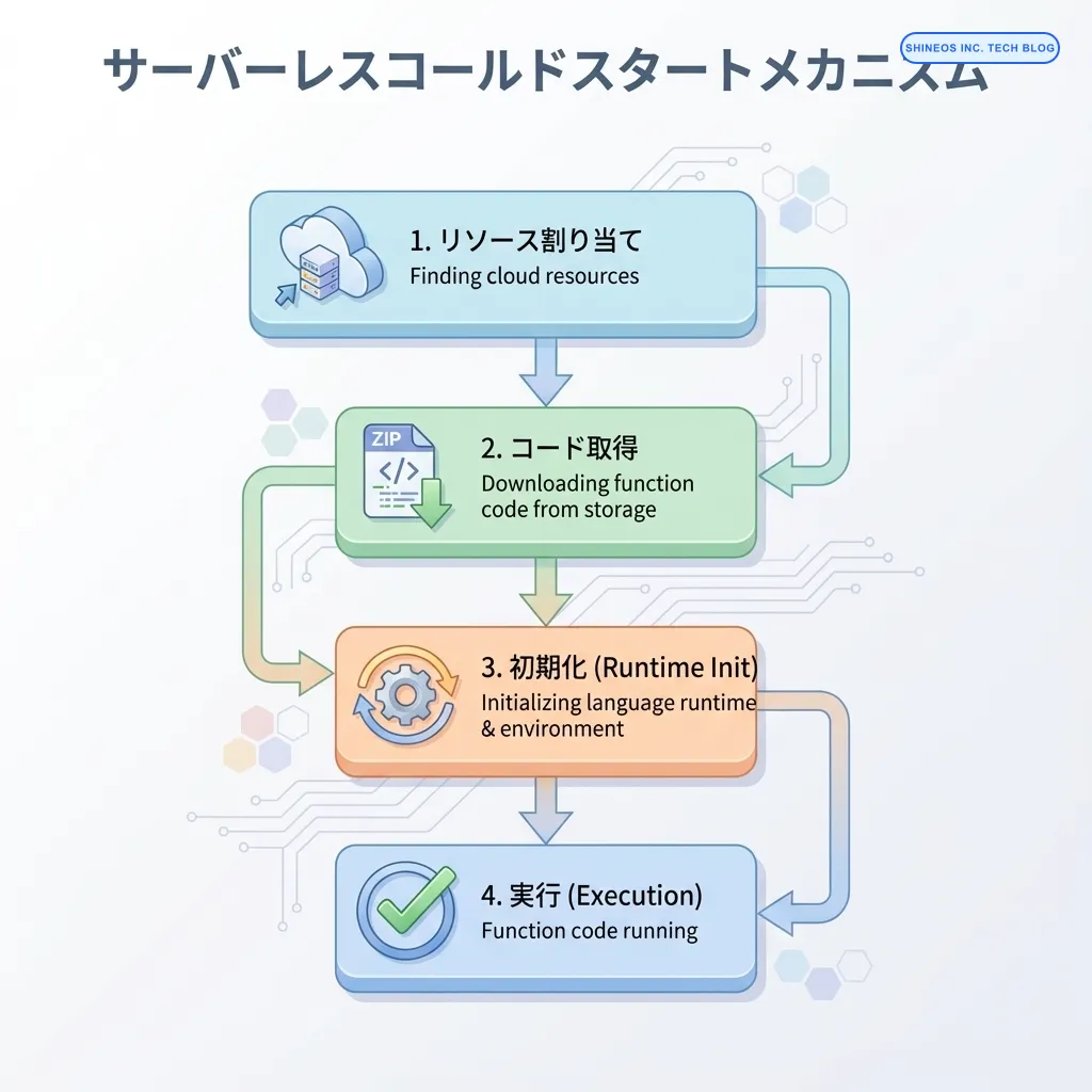 サーバーレス環境において、しばらく実行されていない関数が呼び出された際、クラウドプロバイダーが新しい実行環境(コンテナ)を立ち上げ、コードをロードし、初期化処理を行う必要があるために発生する遅延のことです。